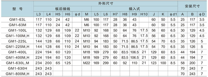 按產(chǎn)品極數(shù)分為二極、三極與四極,四極產(chǎn)品中中性極(N極)的型試分四種: A型:N極不安裝過(guò)電流脫扣器,且N極始終接通,不與其它三極一起合分; B型:N極不安裝過(guò)電流脫扣器,且N極與其它一極一起合分(N極先合后分); C型:N極安裝過(guò)電流脫扣器,且N極與其它三極一起合分(N極先合后分); D型:N極安裝這電流脫扣器,且N極始終接通,不與其它三極一起合分。 按額定電流分: GM1-63為(6)、10、16、20、25、32、40、50、63A九級(jí)(6A規(guī)格無(wú)過(guò)載保護(hù)) GM1-100為(10)、16、20、25、32、40、50、63、80、100A十級(jí); GM1-160為100、125、140、160A四級(jí); GM1-225為100、125、140、160、180、200、225A七級(jí); GMl-400為225、250、315、350、400A’~’級(jí); GM1-630為400、500、630A三級(jí); GM1-800為630、700、800A三級(jí); 按接線方式分:板前接線、板后接線、插入式接線三種。 按過(guò)電流脫扣器型式分熱動(dòng)—電磁(復(fù)式)型、電磁(瞬時(shí))型兩種。 按斷路器有無(wú)附件分帶附件和不帶附件兩種。 |